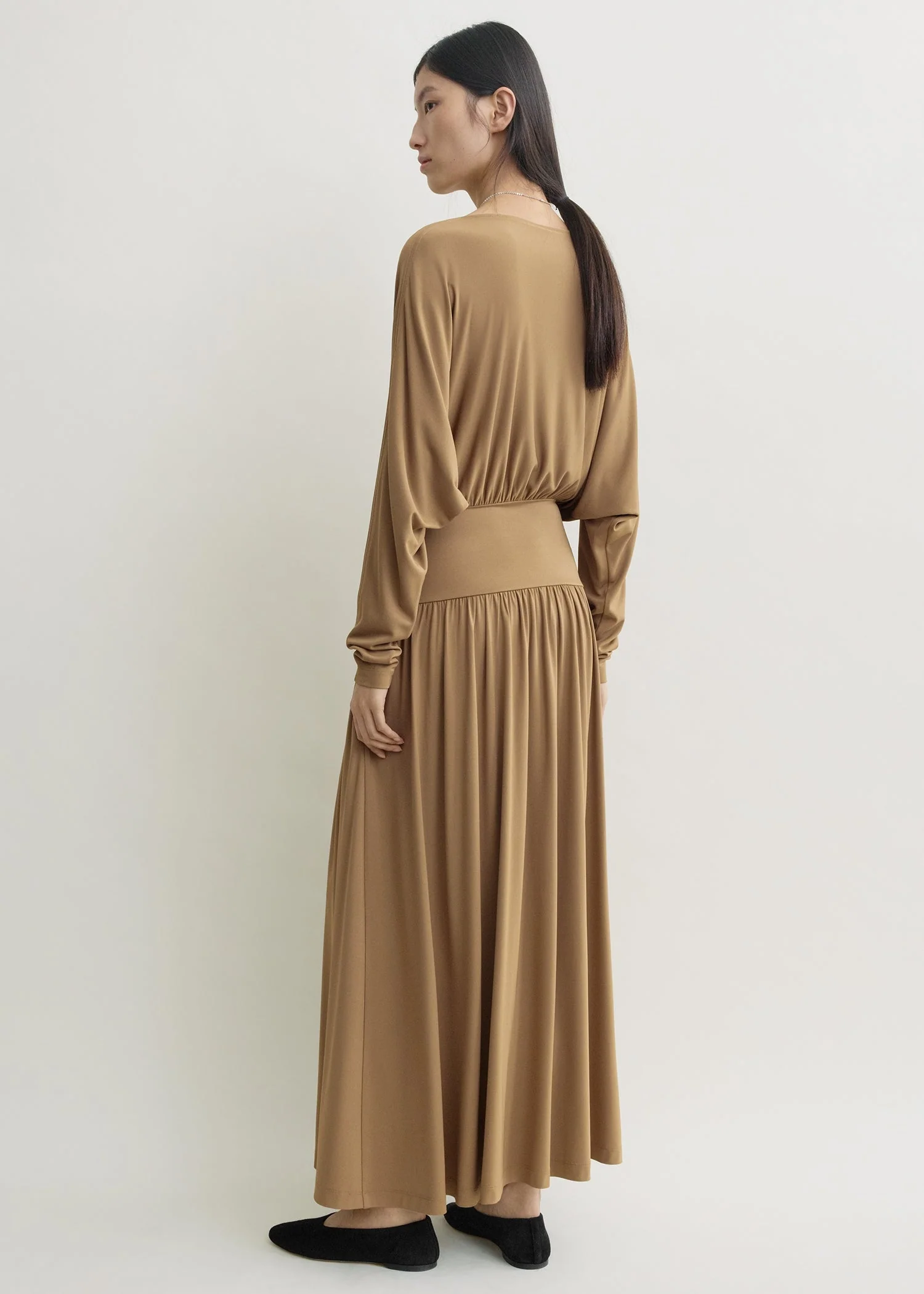 Refined pull-on dress crafted from fluid jersey with a sophisticated boat neckline and sculptural batwing sleeves. The silhouette cinches at the waist before flowing into a graceful mid-calf skirt. Add a necklace and wear with ballerinas to complement the elongated silhouette.