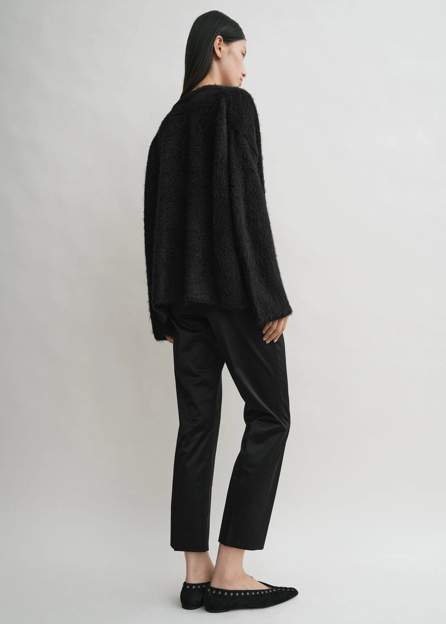 Signature TOTEME sweater reworked in light, soft and feathery silk. It is shaped to a wide, oversized silhouette with a round neck, dropped shoulders and extra-long sleeves. Wear it over trousers to work.