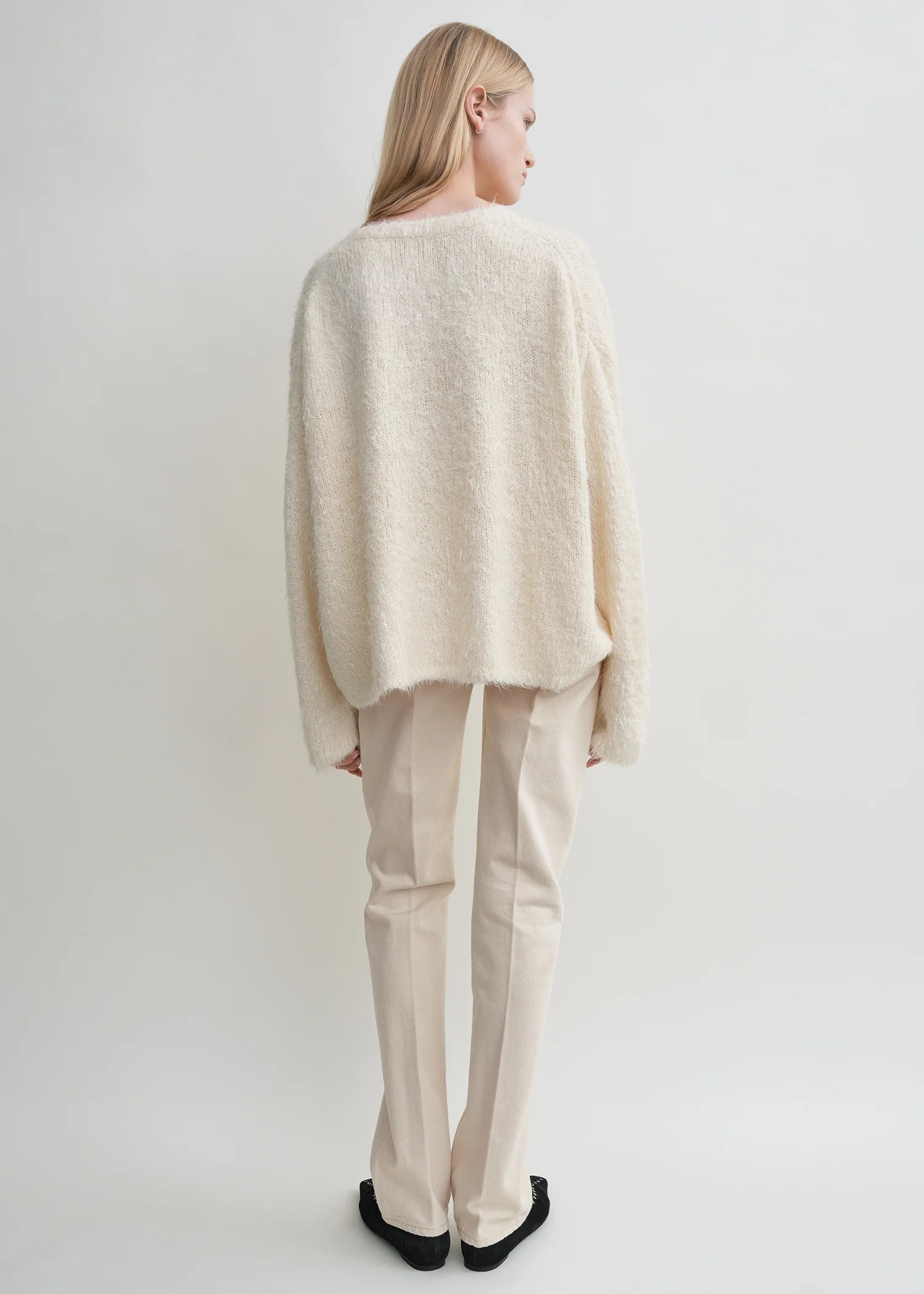 Signature TOTEME sweater reworked in light, soft and feathery silk. It is shaped to a wide, oversized silhouette with a round neck, dropped shoulders and extra-long sleeves. Wear it over trousers to work.