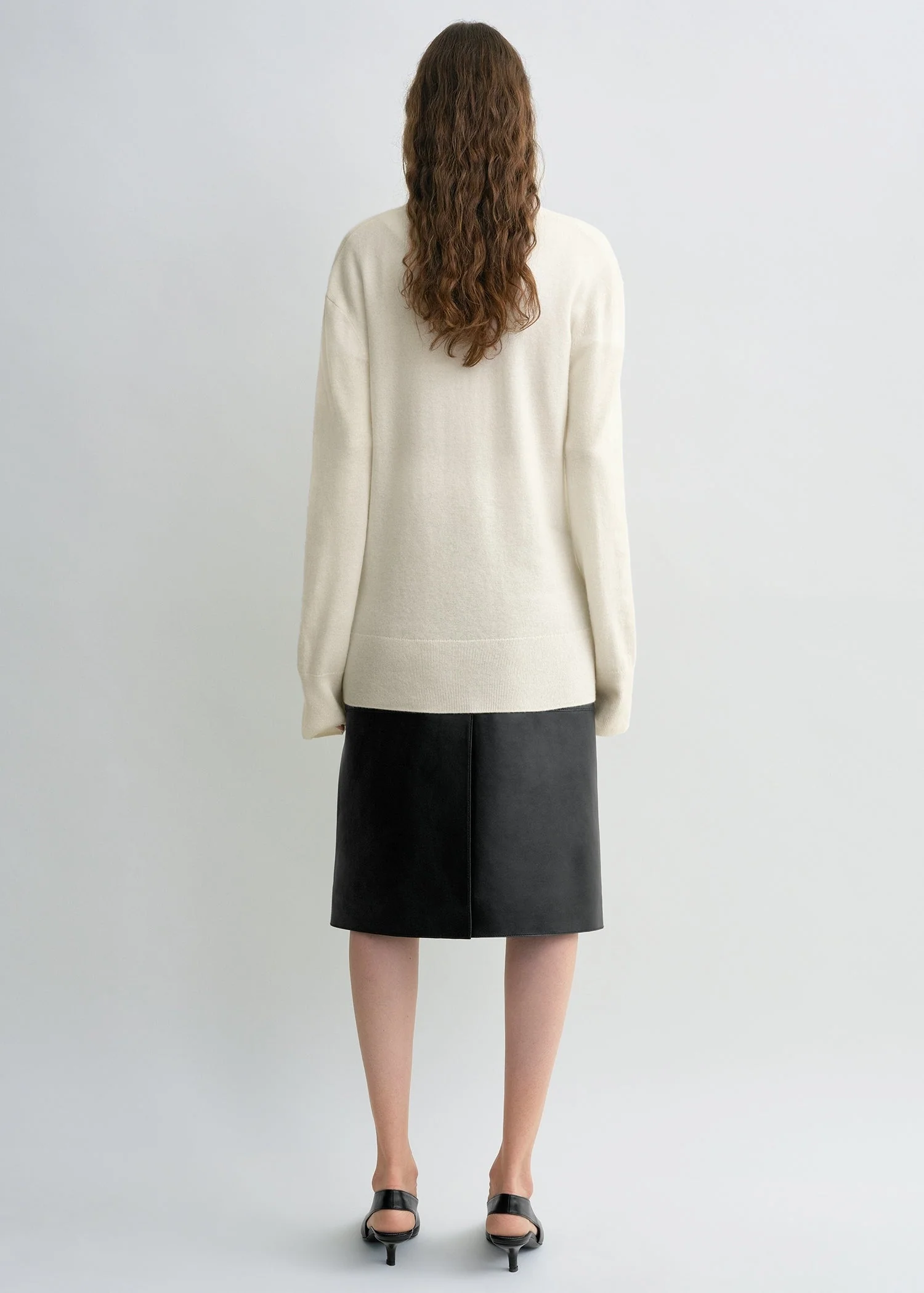 Designer's note: "This TOTEME Garderob cashmere knit has been reimagined with a relaxed, elongated silhouette and a deep V-neckline that reveals a hint of skin. Wear it as a fine, soft layer on chilly evenings or style it over a white crew-neck tee as a considered contrast.”