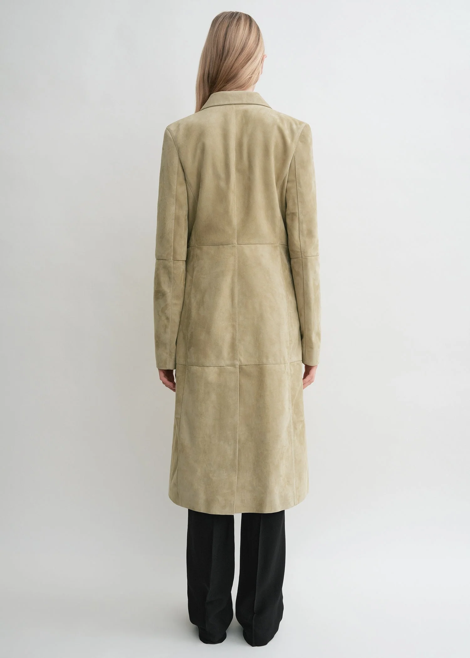 TOTEME coat crafted from supple lambskin suede to a slim, paneled construction cinched at the waist with flattering darts. It fastens with front buttons leading to a fully lined interior and has concealed side pockets for a stylish edge. Use it to elevate city looks.