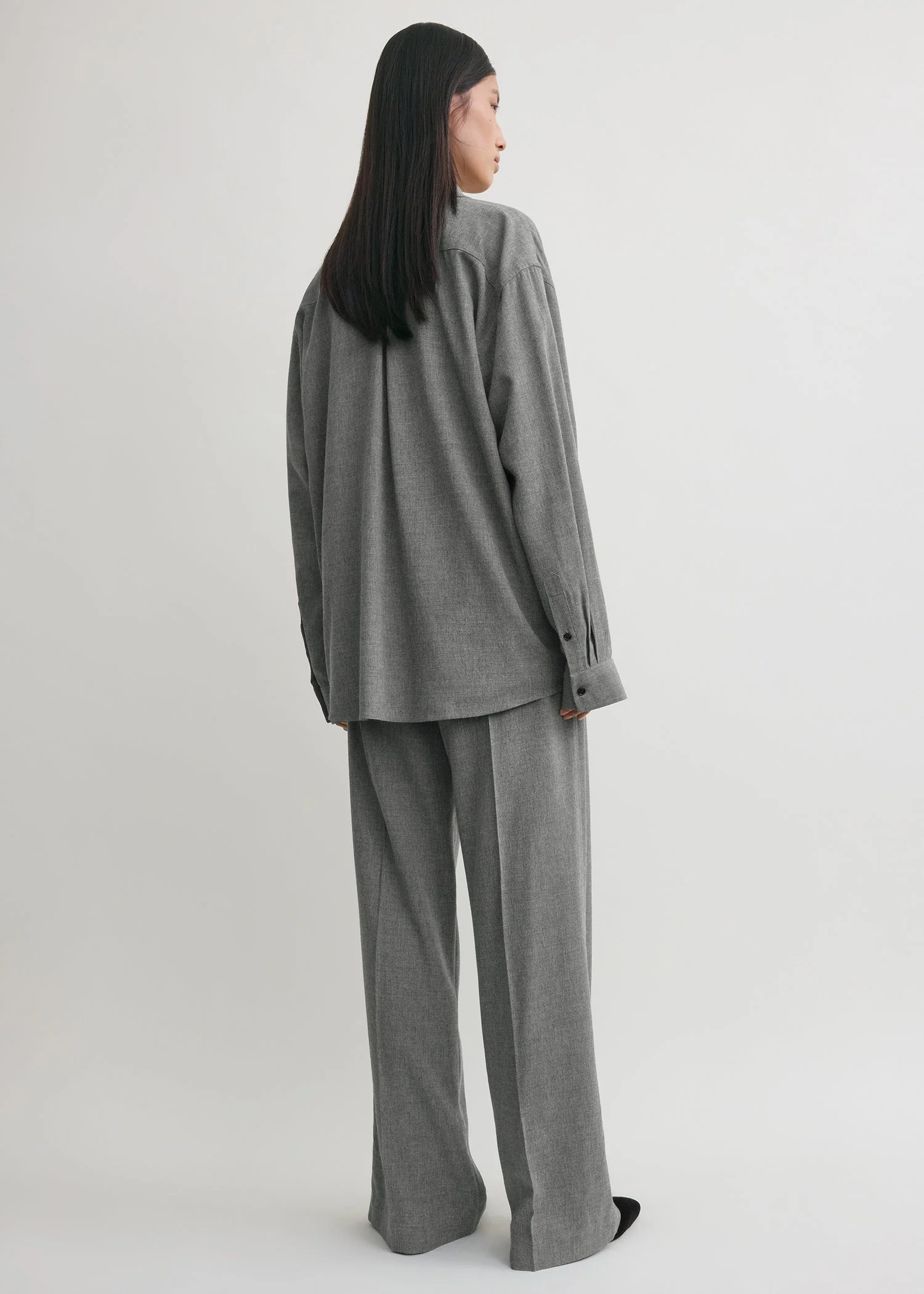 Classic shirt reworked in a fluid viscose-wool blend for a polished everyday look. It has a longline, oversized silhouette with dropped shoulders and a buttoned placket and cuffs. Wear it in trans-seasonal weather over a simple tee.