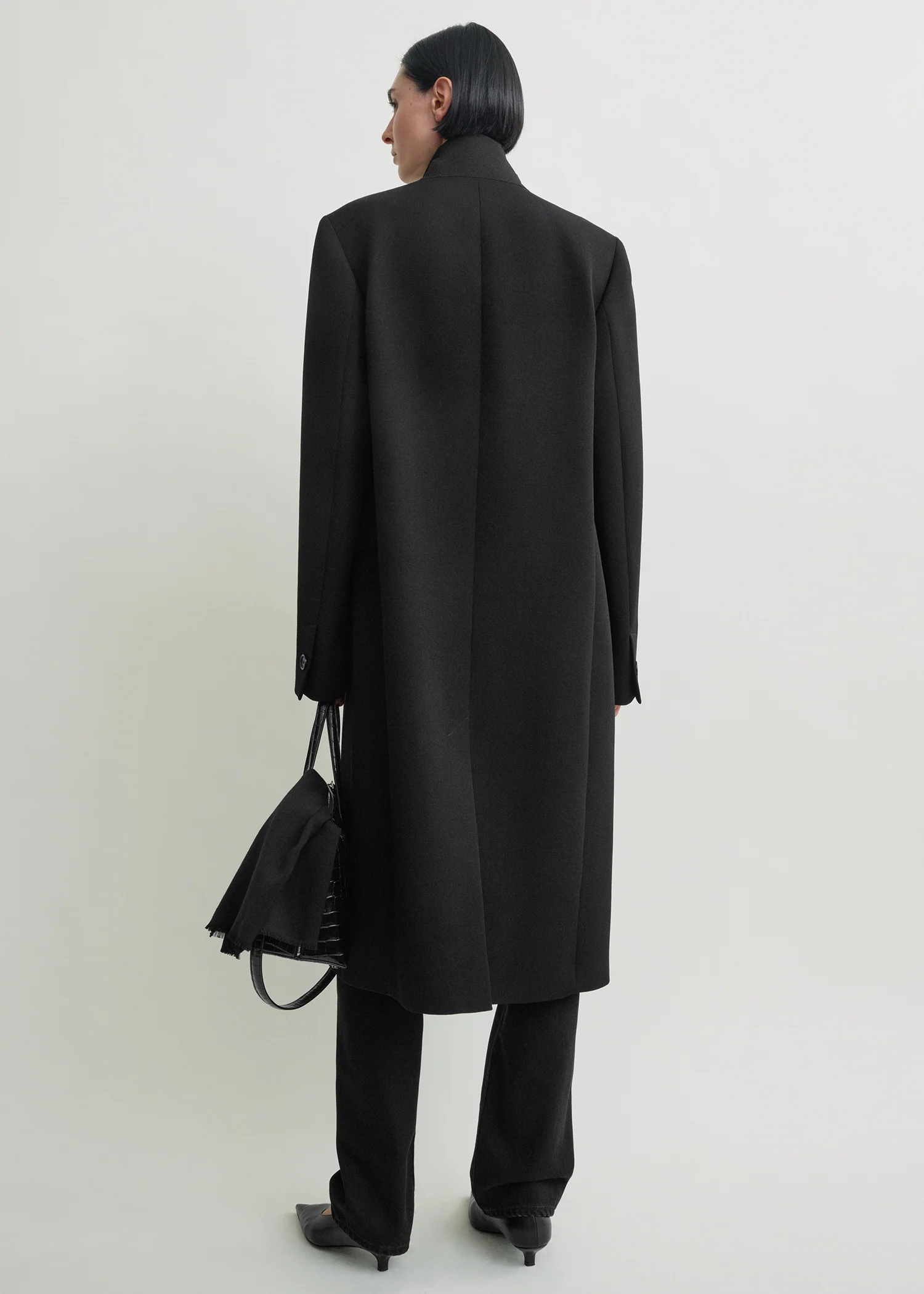 Designer’s note: “Taking a classic Crombie coat as a starting point, we designed this Garderob style with an oversized silhouette instilled with refined appeal. By styling it with turned-up lapels and rolled sleeves we turn it into a versatile piece that can be easily dressed up and down – look closer to appreciate the TOTEME Grid, a fine windowpane check tinted in our emblematic monochrome tones."