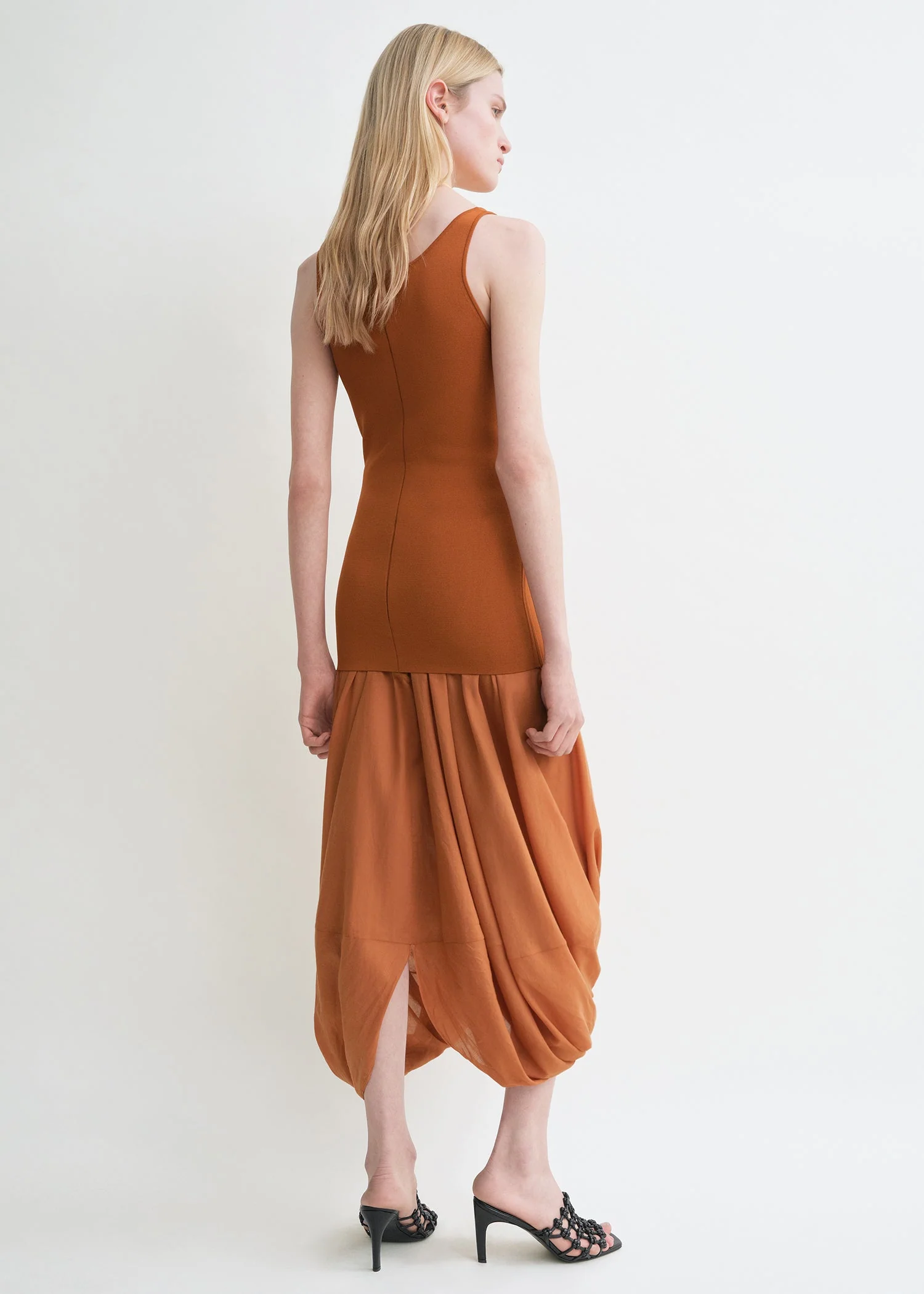 TOTEME dress featured on the Summer 25 runway, taking place at New York Fashion Week. It consists of a long tank top made from compact jersey and followed by twisted panels inspired by cocoons. Add a pair of heeled sandals to attend an open-air event.