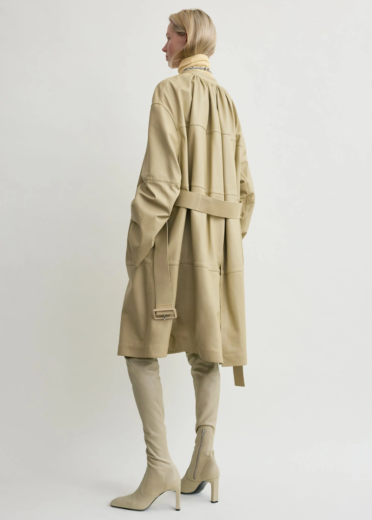 Featured on the Fall Winter 25 runway, this soft, nappa leather coat has a collarless neckline gathered gently at the nape and can be cinched around the waist with a matching belt inspired by classic trench coats. Complement the knee-length hem with high boots.