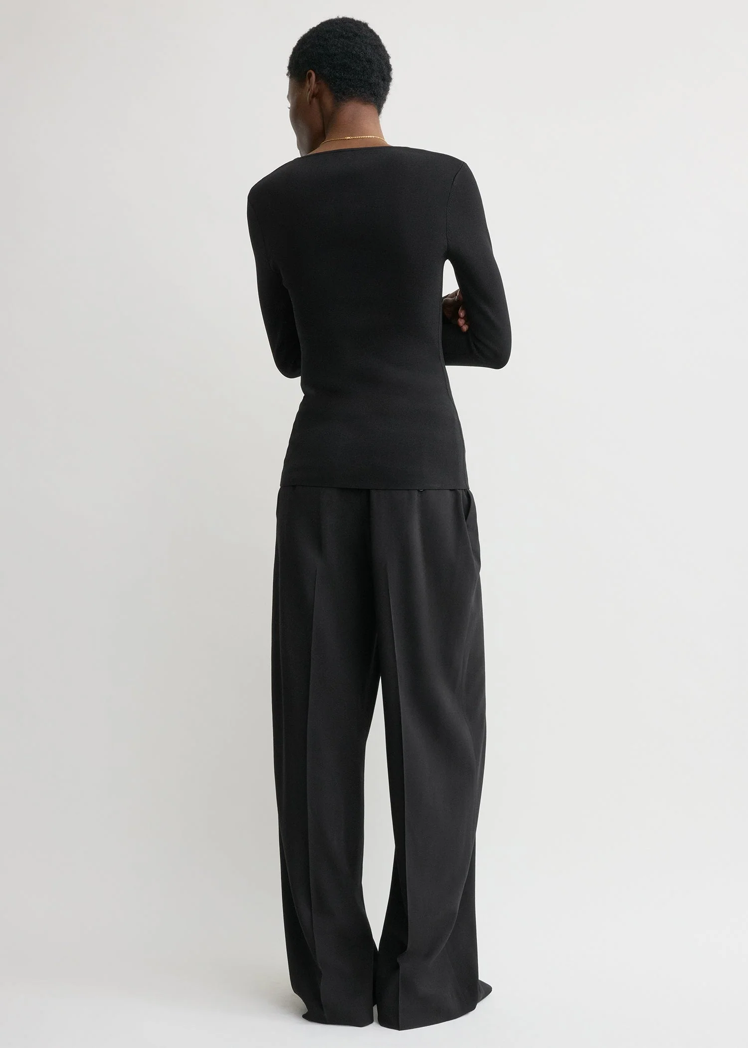 Foundational wardrobe piece crafted from our signature compact knit with a spacious scoop neck and slim long sleeves. Offset the slim silhouette with relaxed trousers.