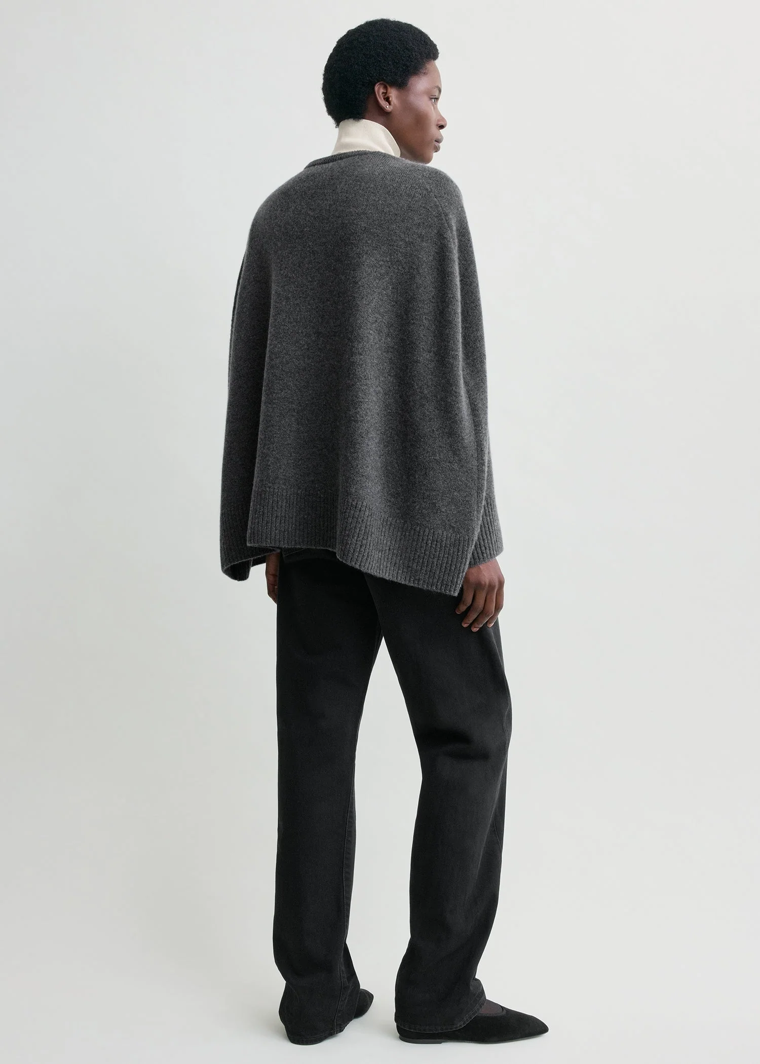 A crew-neck knit layered under a longer cape for dramatic effect. It is knitted from warm cashmere with a soft hand feel and ribbed edges. Offset the soft drape with tailored trousers.