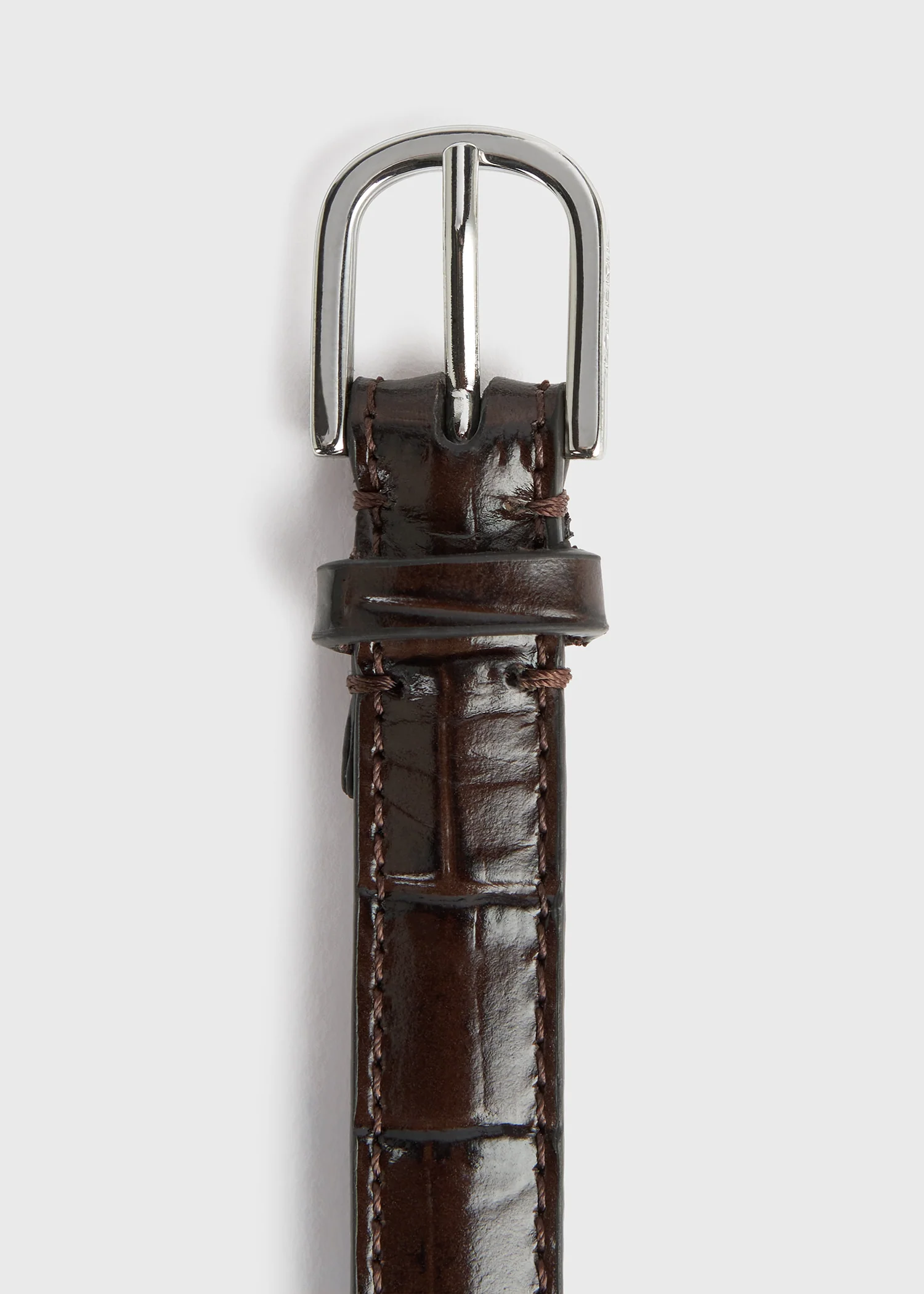 Slim belt accented with TOTEME's distinctive double clasp in silver-tone metal. It's crafted in Italy from responsibly sourced leather debossed with a crocodile pattern and comes in a single size that can be adjusted between 75cm and 95cm. Wear it at the waist with trousers and skirts.