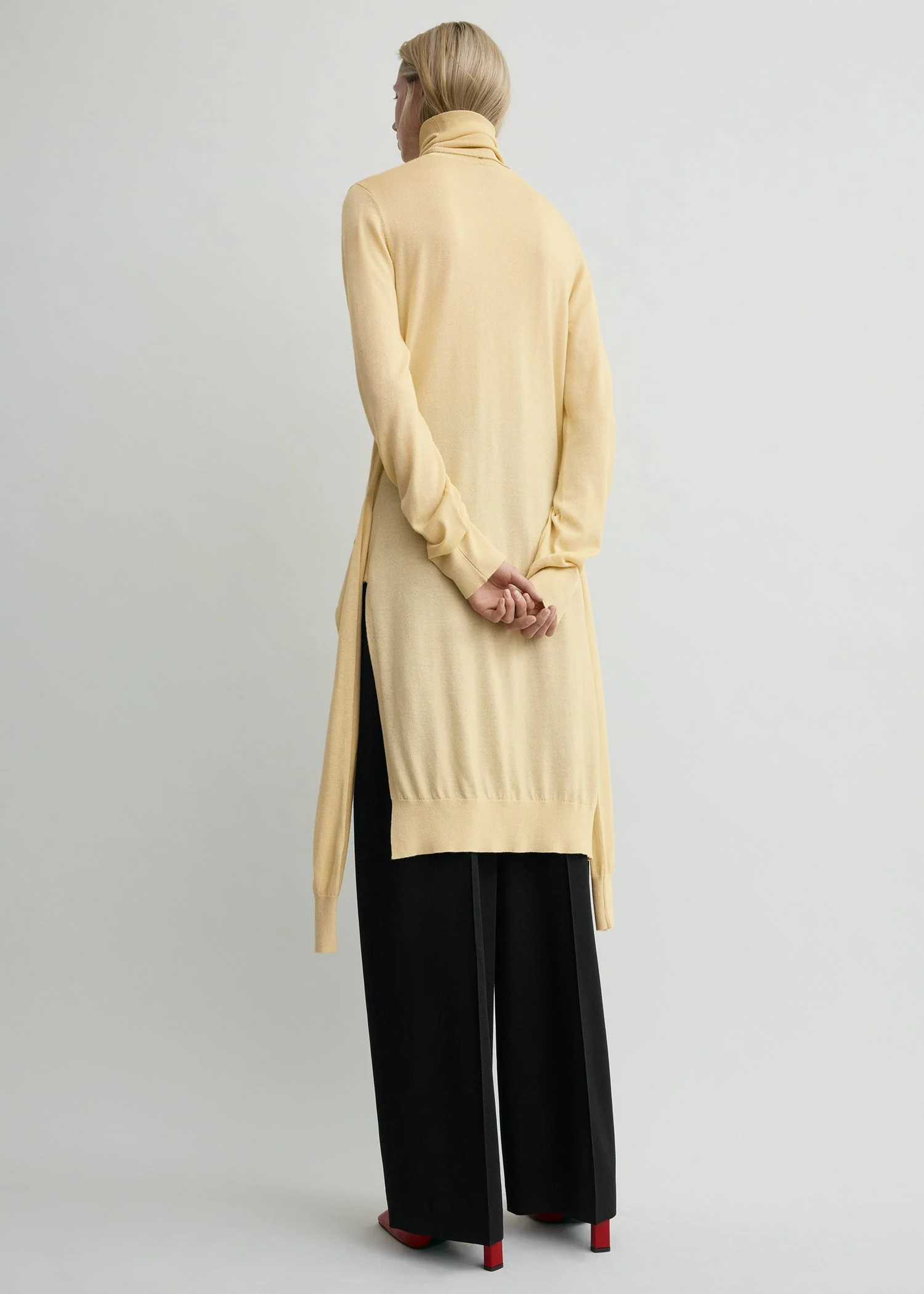Directional turtleneck featuring additional sleeves at the hips that create the illusion of a second sweater casually tied around the waist. It is finely knitted to a slim shape made from wool blended with a hint of silk.