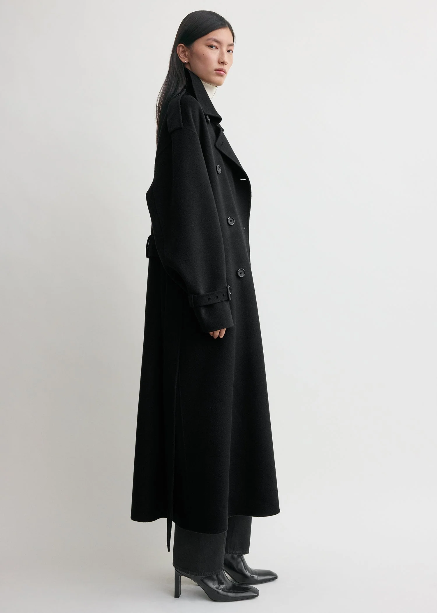 This winter coat builds on the silhouette of our effortless Crisp summer trench from the Garderob curation. Made from warm and fluid wool doublé, it has a double-breasted construction secured with a low-sitting belt replicated at the cuffs.