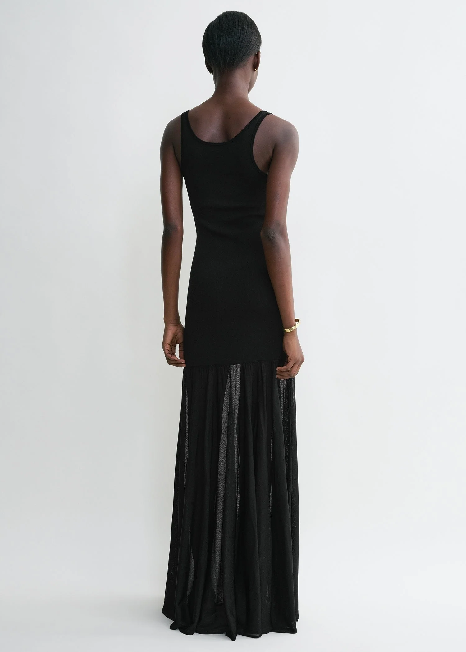 TOTEME tank dress reimagined as an understated evening piece. Made from compact stretch jersey, it has a tank top-inspired neckline followed by a slim waist and hips and a sheer floor-length skirt with a soft plissé finish. Choose classic jewelry as a sophisticated complement.