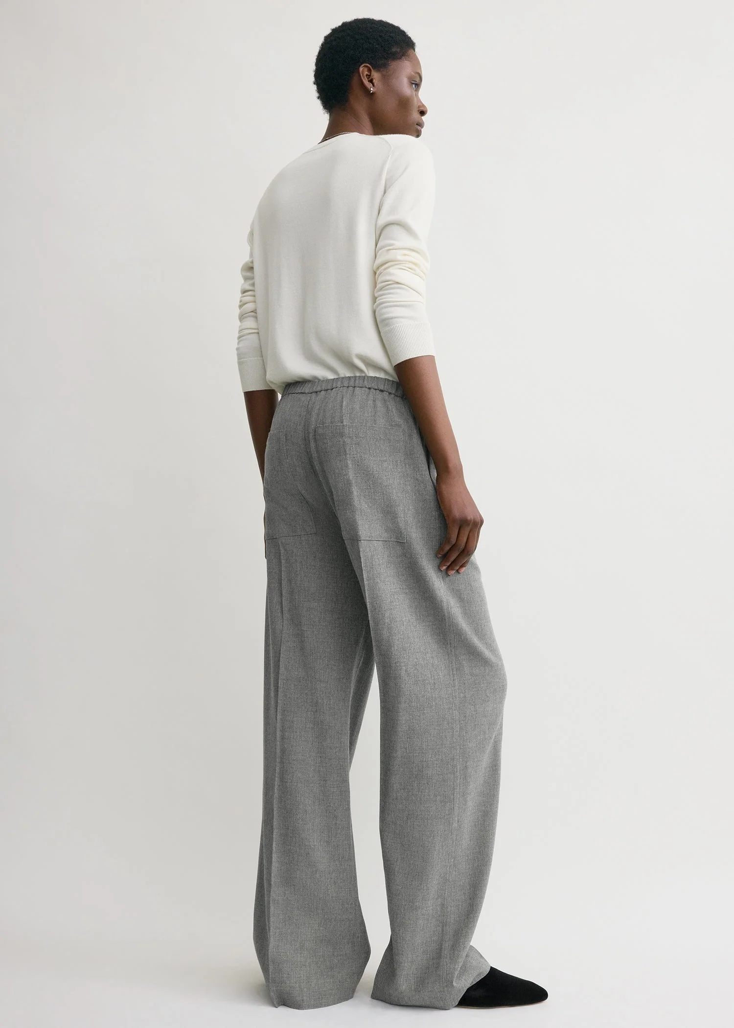 Laid-back trousers reworked for the winter in lightweight, fluid canvas with a touch of wool for warmth. They have a high waist with side and back pockets and flared, wide legs for a sculptural effect. Wear them as an effortless day look with a simple knit.
