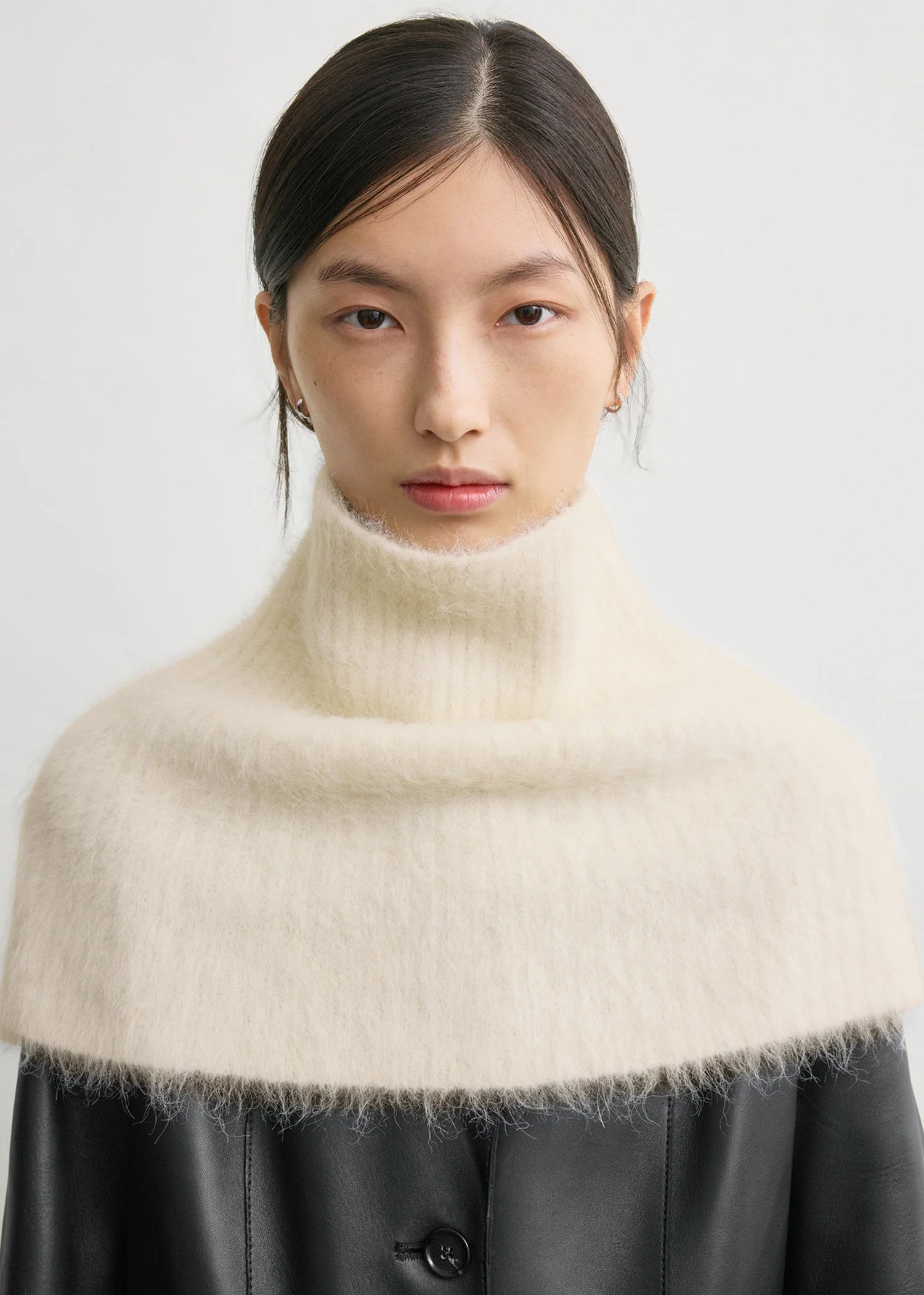 A directional neck warmer shaped to emulate a funnel neckline and rib-knitted from a warm alpaca blend that is brushed for softness. Layer it over a coat for extra warmth.