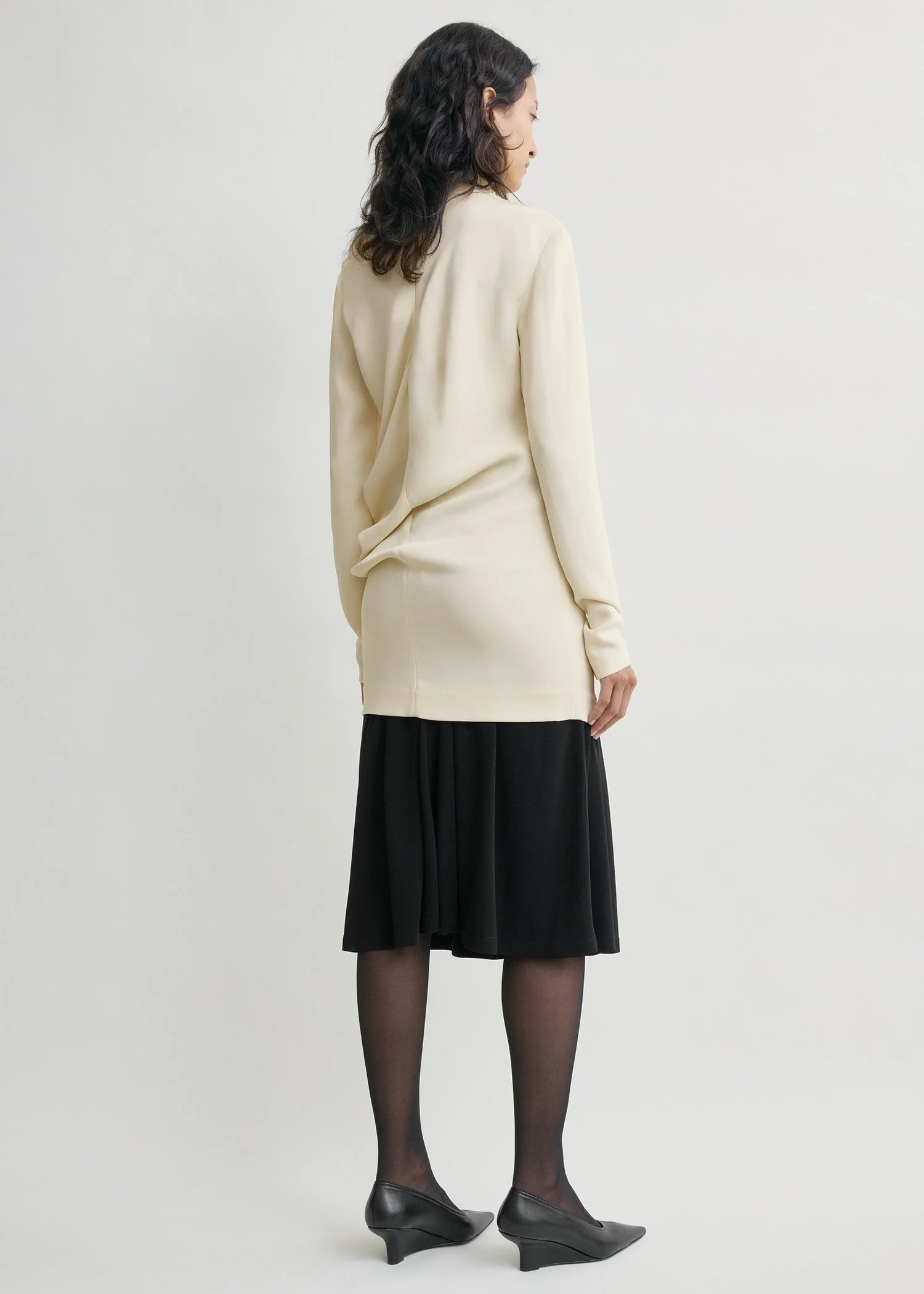 High-neck cady top with a playful twisted construction that gently hugs the body, creating volume and movement. Add a necklace to complement the elongated silhouette.