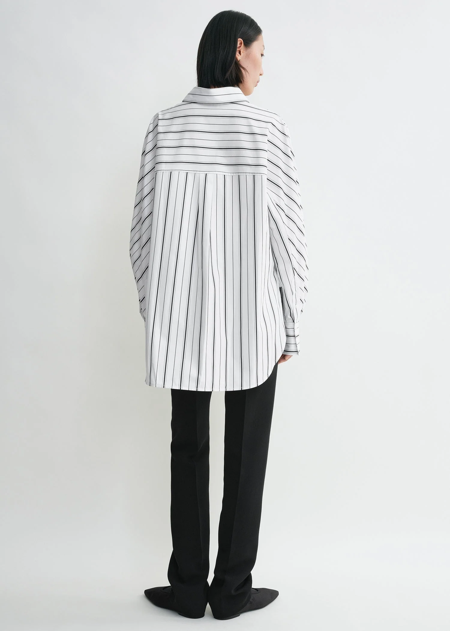 TOTEME shirt skillfully constructed with a back yoke that expands into kimono-style sleeves. It is woven from organic-cotton poplin woven with black and white stripes to an oversized, longline cocoon shape with a dramatically stepped hem. Wear it on weekdays with trousers and on the weekend with jeans.