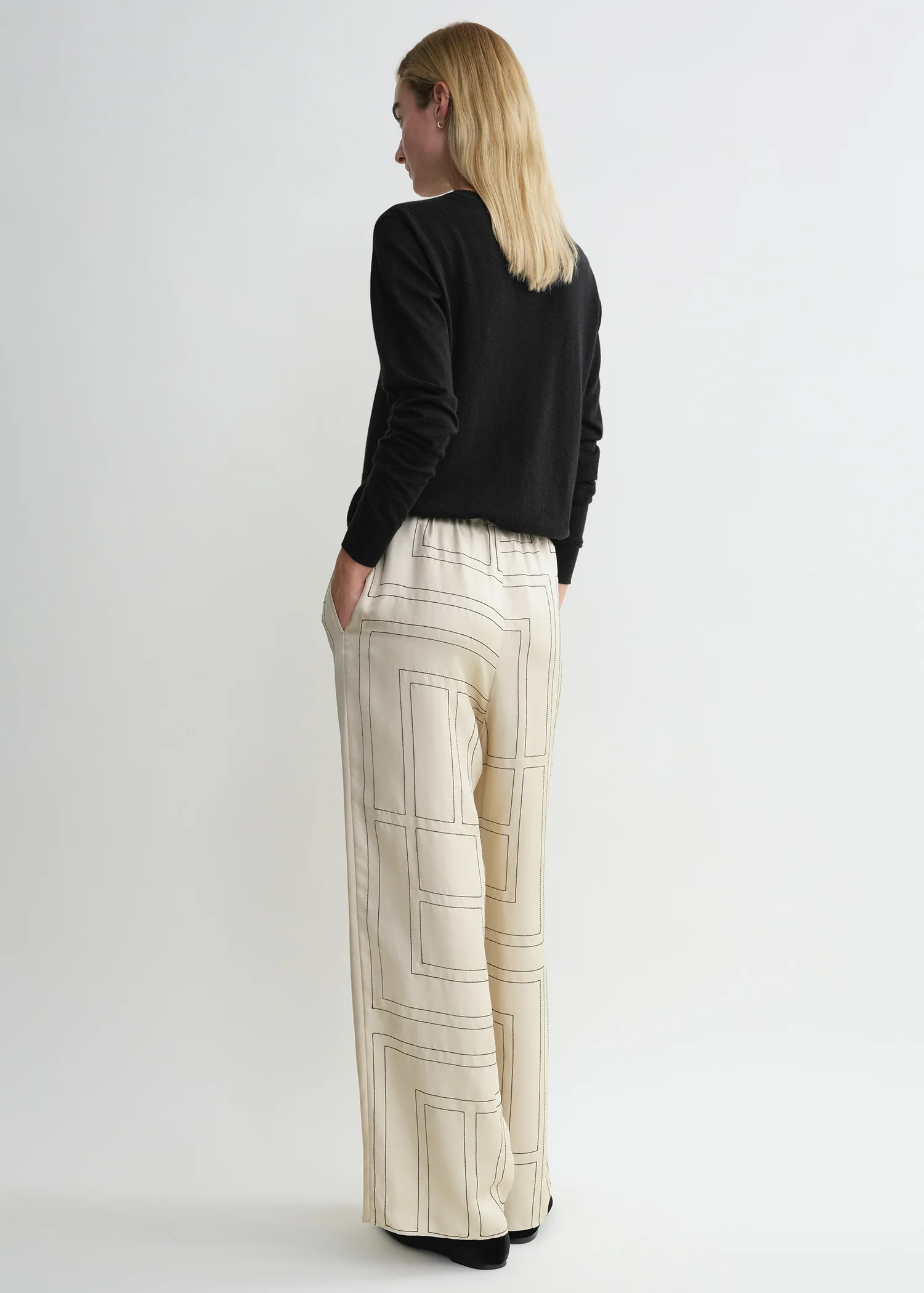 TOTEME trousers made from mid-weight, fluid silk twill embroidered with a fine monogram pattern in contrasting black thread. They have a relaxed, straight-leg silhouette inspired by classic pajamas and are finished with an elasticated waistband and side pockets. Coordinate them with the Monogram silk pj top or with a simple tank.