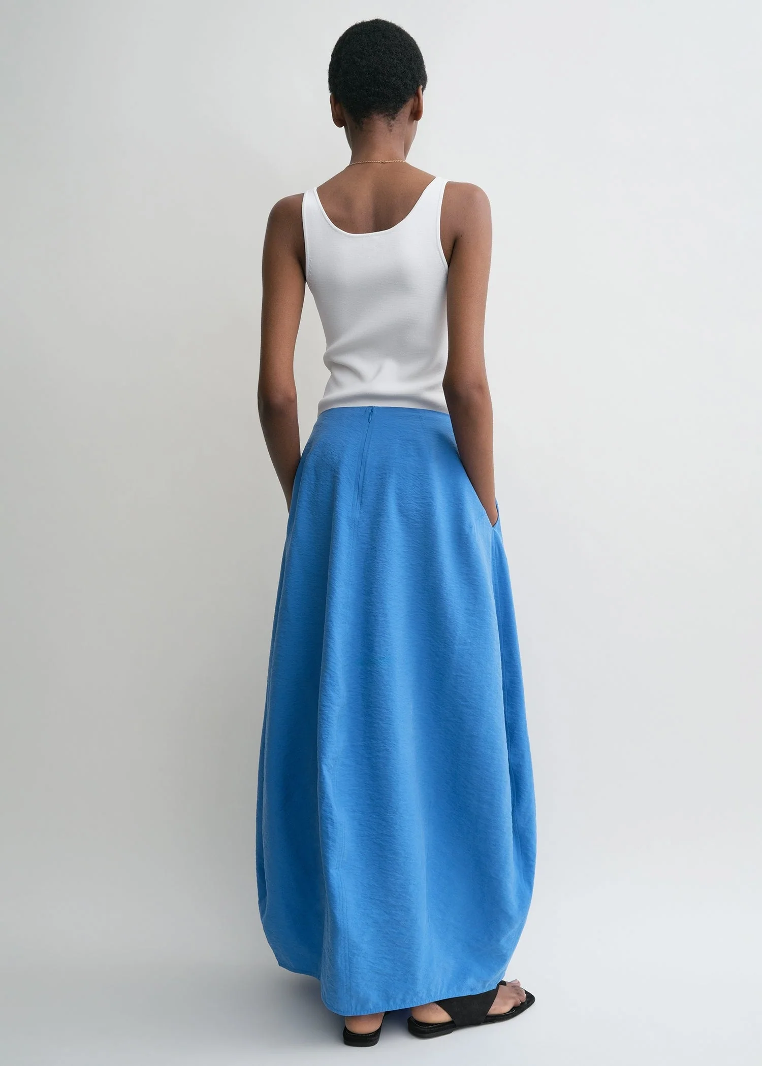 Parachute-style TOTEME skirt crafted from an airy and softly textured silk blend. It has a long and ample egg shape with side pockets and a concealed back zipper. Offset the voluminous silhouette with a slim top.