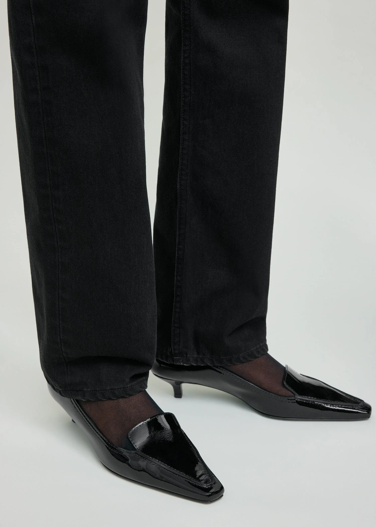 Merging elements from loafers and pumps, these patent-leather shoes rest on a kitten heel to make a neat impression. They are Italian-made from shiny patent leather lined in smooth leather. Wear them with jeans for work.