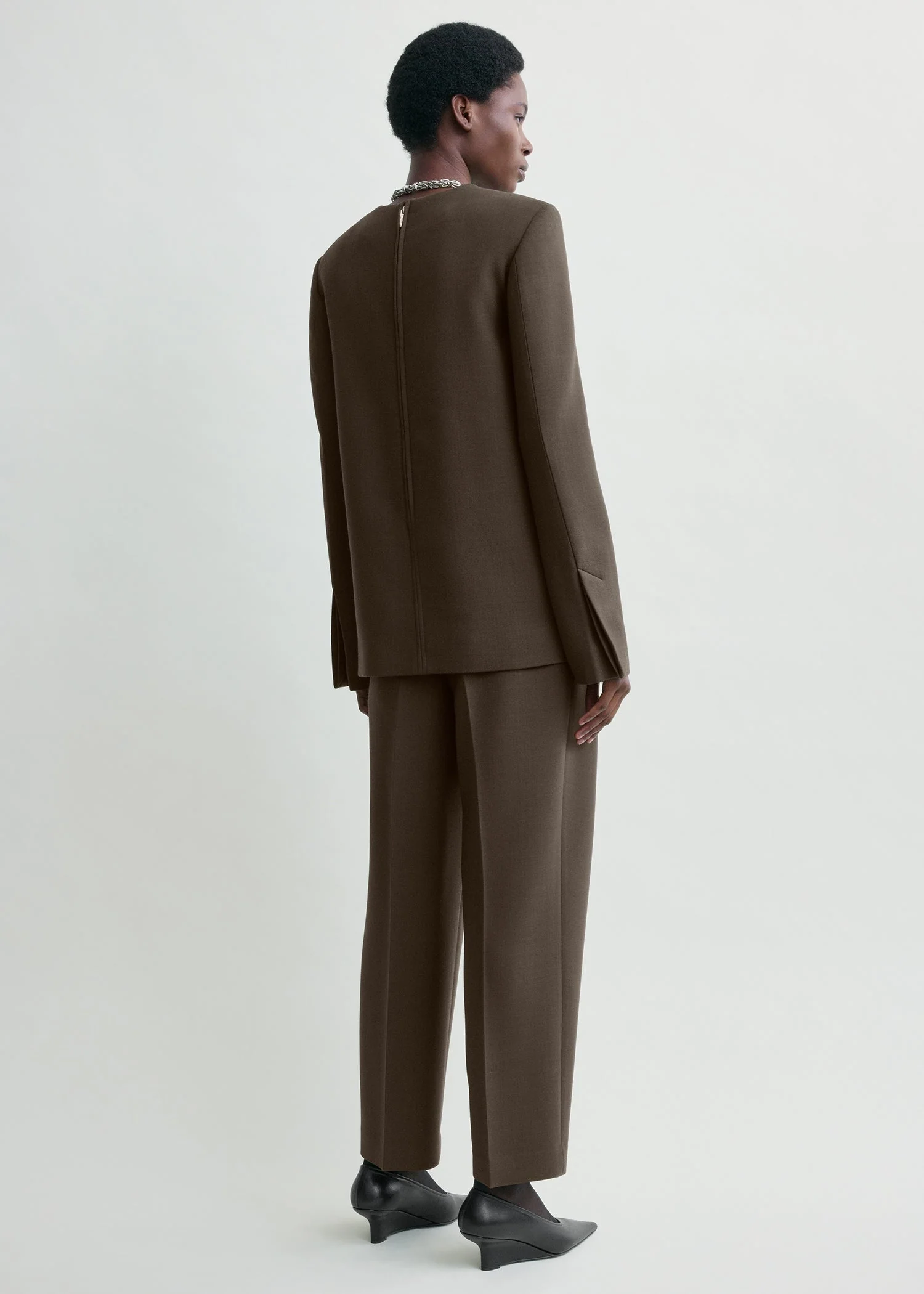 An evening top exuding an effortless tailoring mood. It is made from a mid-weight, spongy suiting fabric accented with flap pockets and a metal zipper. Wear it with coordinating trousers to a meeting.