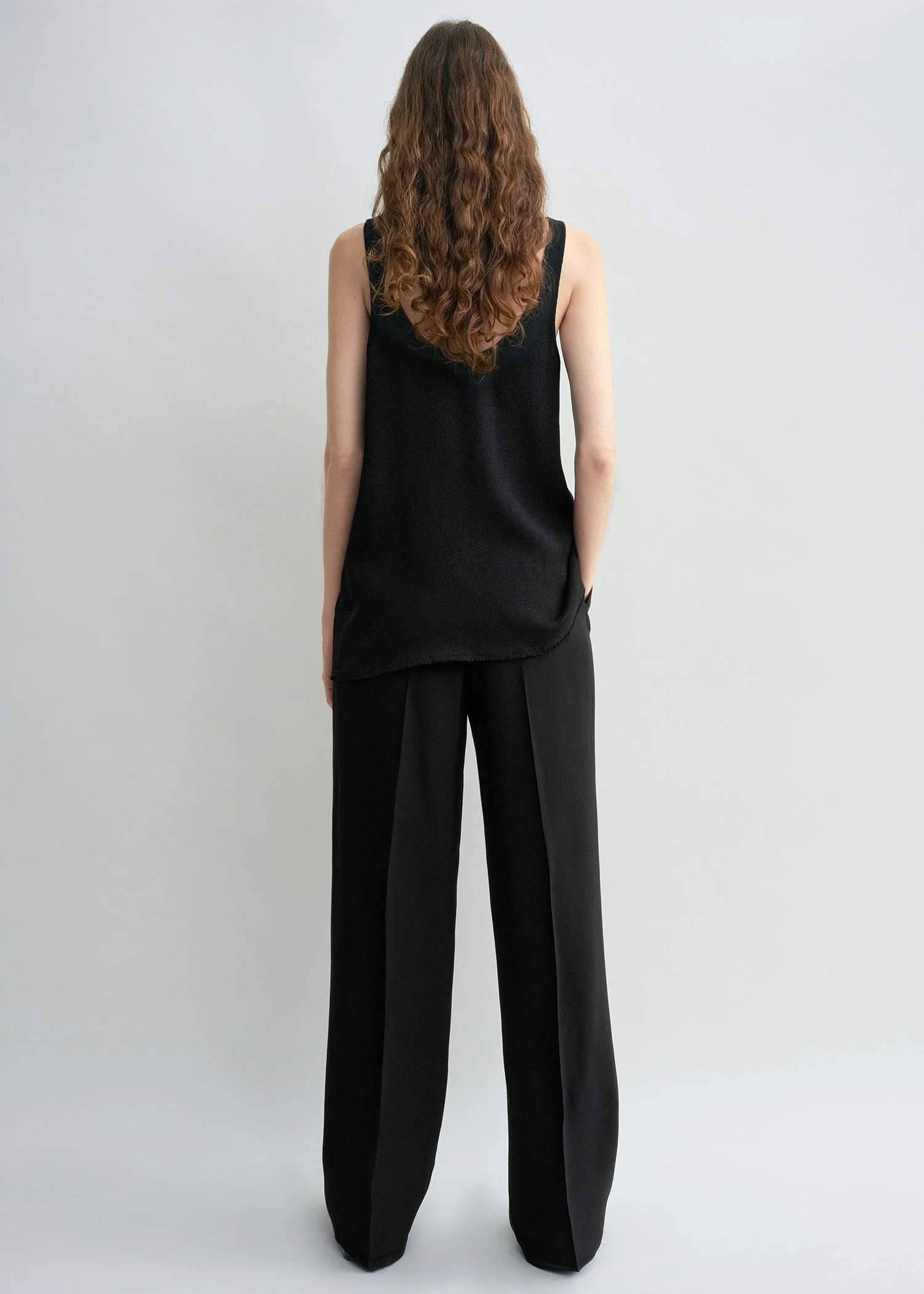 Designer’s note: “What sets this TOTEME Garderob tank apart is its understated scoop neckline and elongated silhouette, elevated by the rich texture of the sablé fabric and the raw, frayed hem. Equally stylish when worn tucked or untucked, we imagine it in macadamia white as part of bohemian summer looks and in black for evening edits."