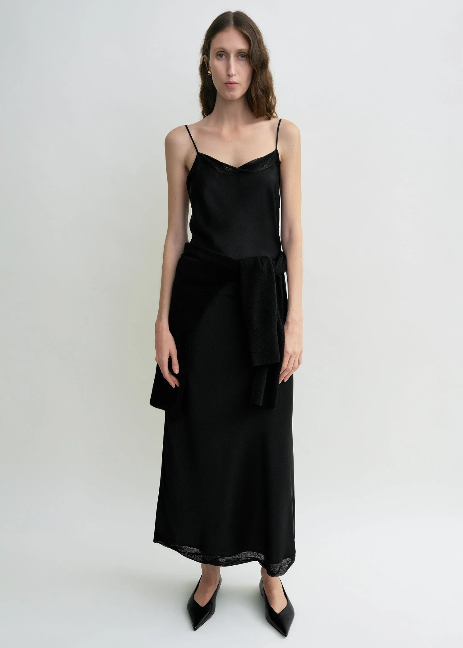 Designer’s note: “We created this TOTEME slip dress from the Garderob curation as a seductive alternative to a little black dress. It has a barely there construction suspended from fine straps and is crafted from featherweight silk satin framed with a tulle trim that’s twisted to add texture."