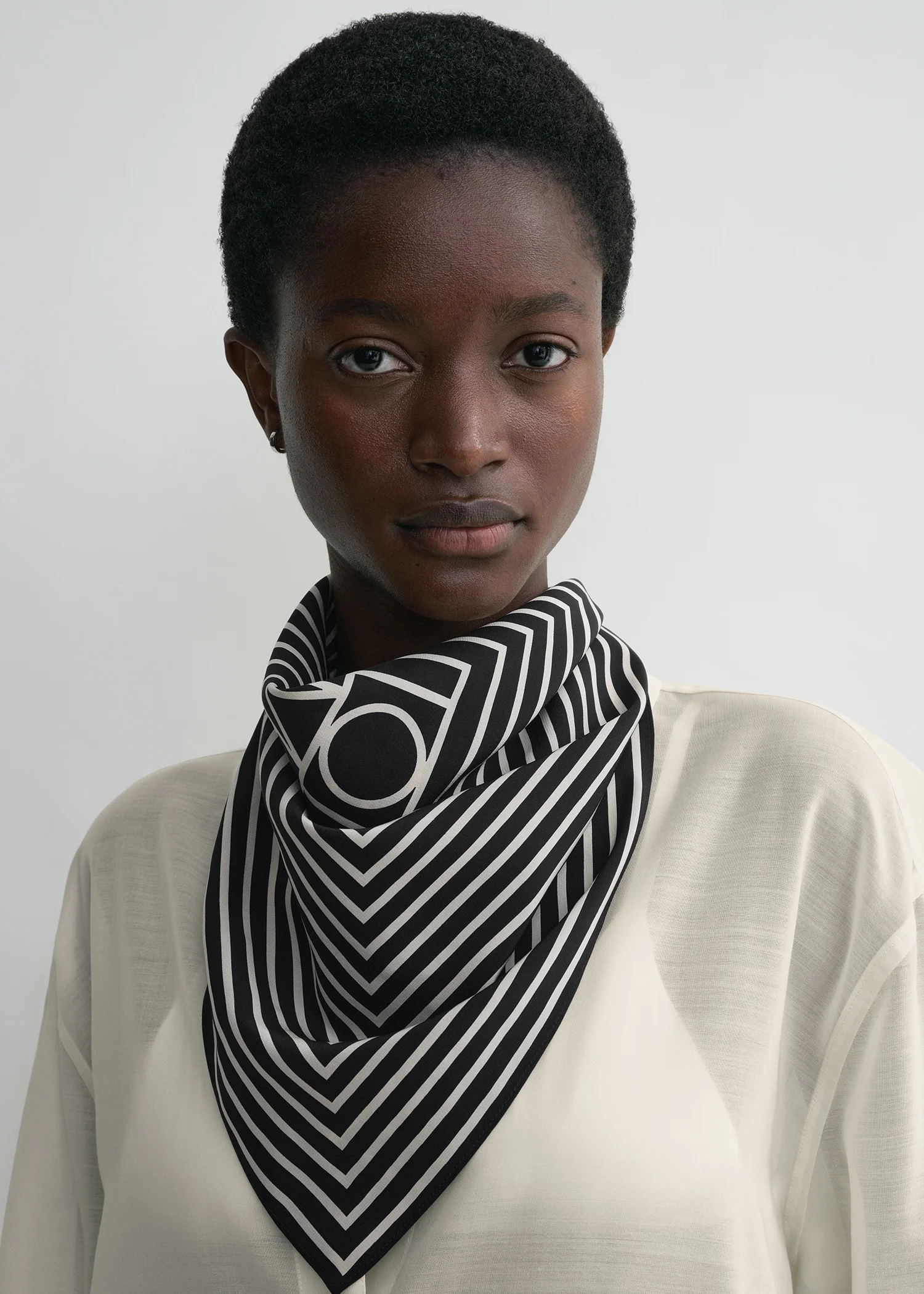 Signature TOTEME scarf woven from featherlight silk yarns. It has a square shape measuring 57x57cm and printed with a black and crème monogram in the middle. Wear it around your neck or over your shoulders.