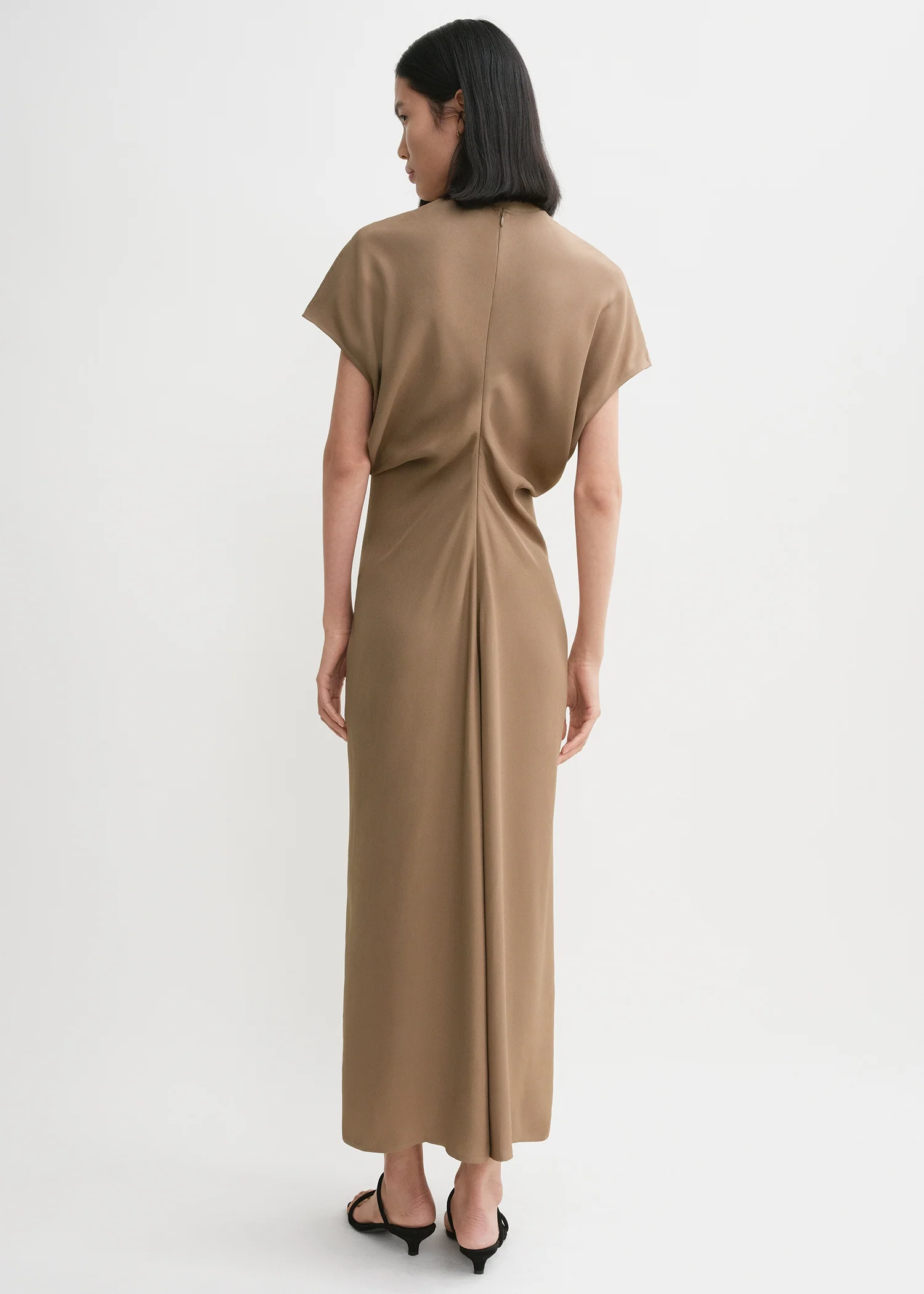 Long TOTEME dress constructed from curved panels that create a slouching effect at the waist when sewn together. It is made from fluid crepe with a soft satin reverse and fastens with a concealed back zipper. Add heeled sandals to complete an unstudied occasion look.