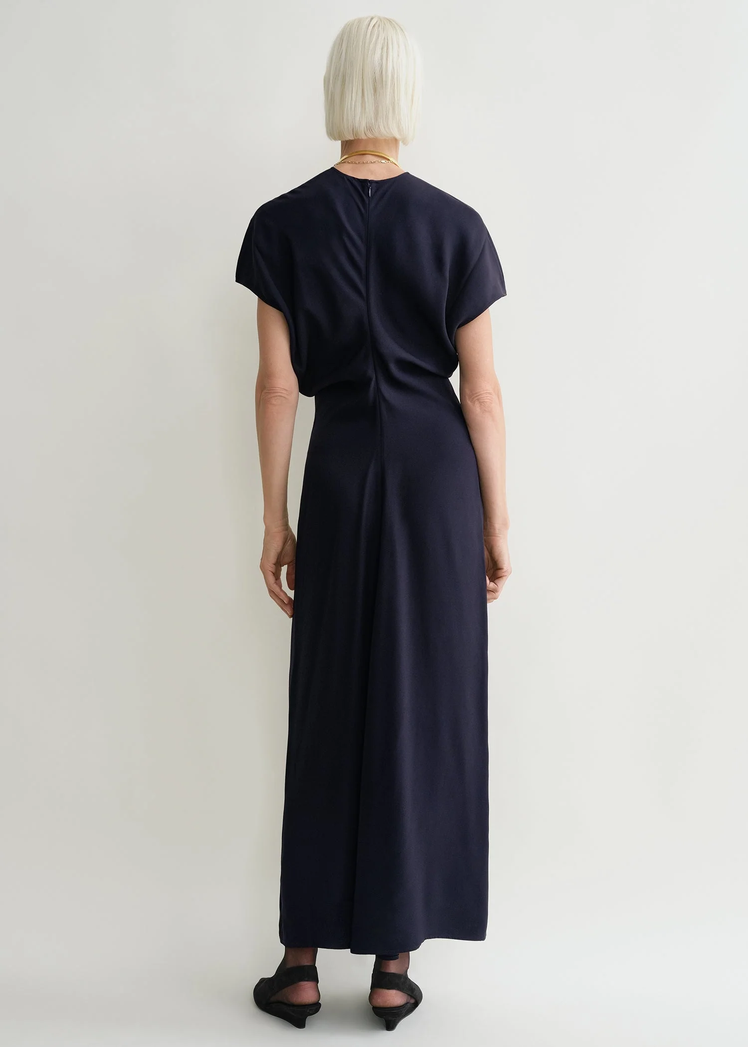 TOTEME dress constructed from curved panels that create a slouching effect at the waist when sewn together. Made from fluid crepe with a lustrous satin reverse, it has cap sleeves and a floor-grazing hem and fastens with a concealed back zipper. Add a clutch and heels to attend an opening night.