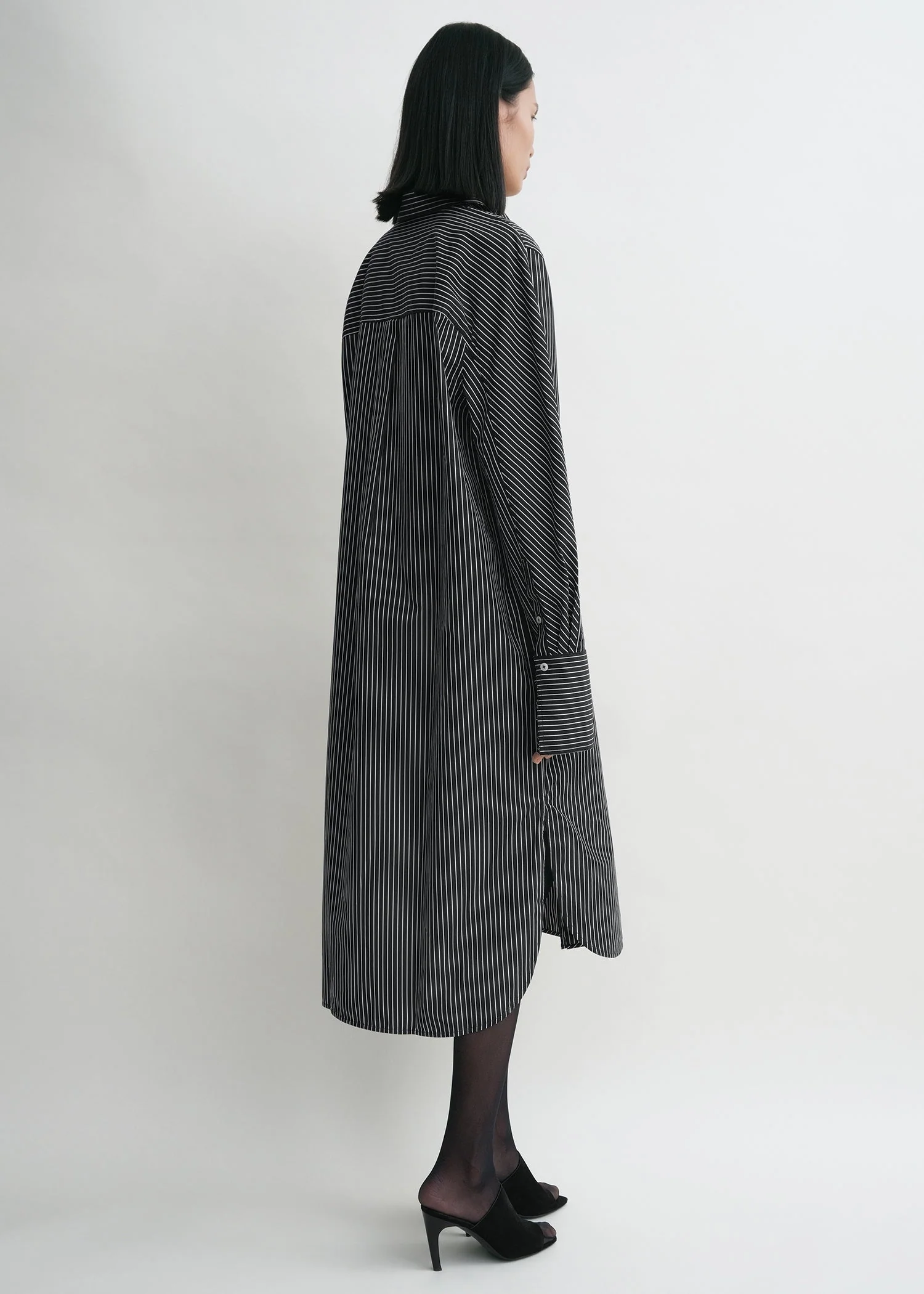 Black and white-striped TOTEME shirtdress finished with raw edges at the collar and cuffs to capture the collection's artisanal mood. It is made from cotton to an oversized silhouette with kimono-style sleeves, a chest pocket and a buttoned placket. Dress it up with heeled mules.