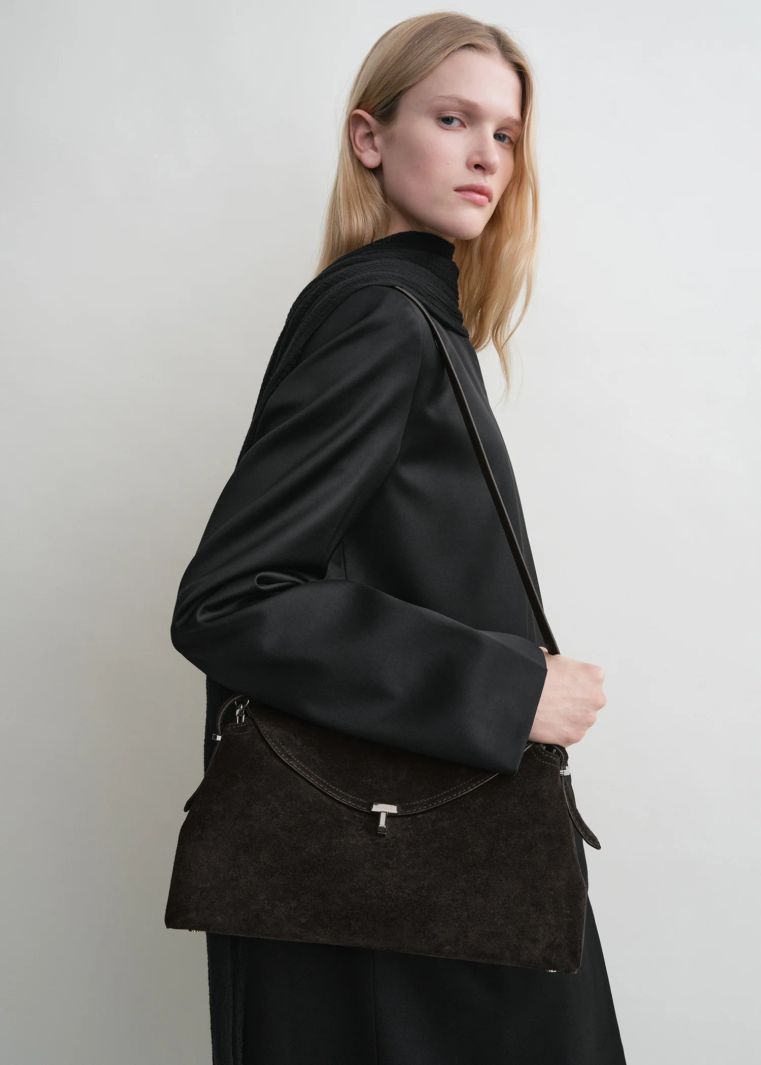 Everyday TOTEME bag outlined with a curved top flap that is shaped to organically complement the hand and arm. It's crafted in Italy from supple suede finished with a silver metal T-lock and protective feet and tonal lining fitted with two slip pockets. Carry it from the top handle or from the detachable and adjustable shoulder strap for different styling options.