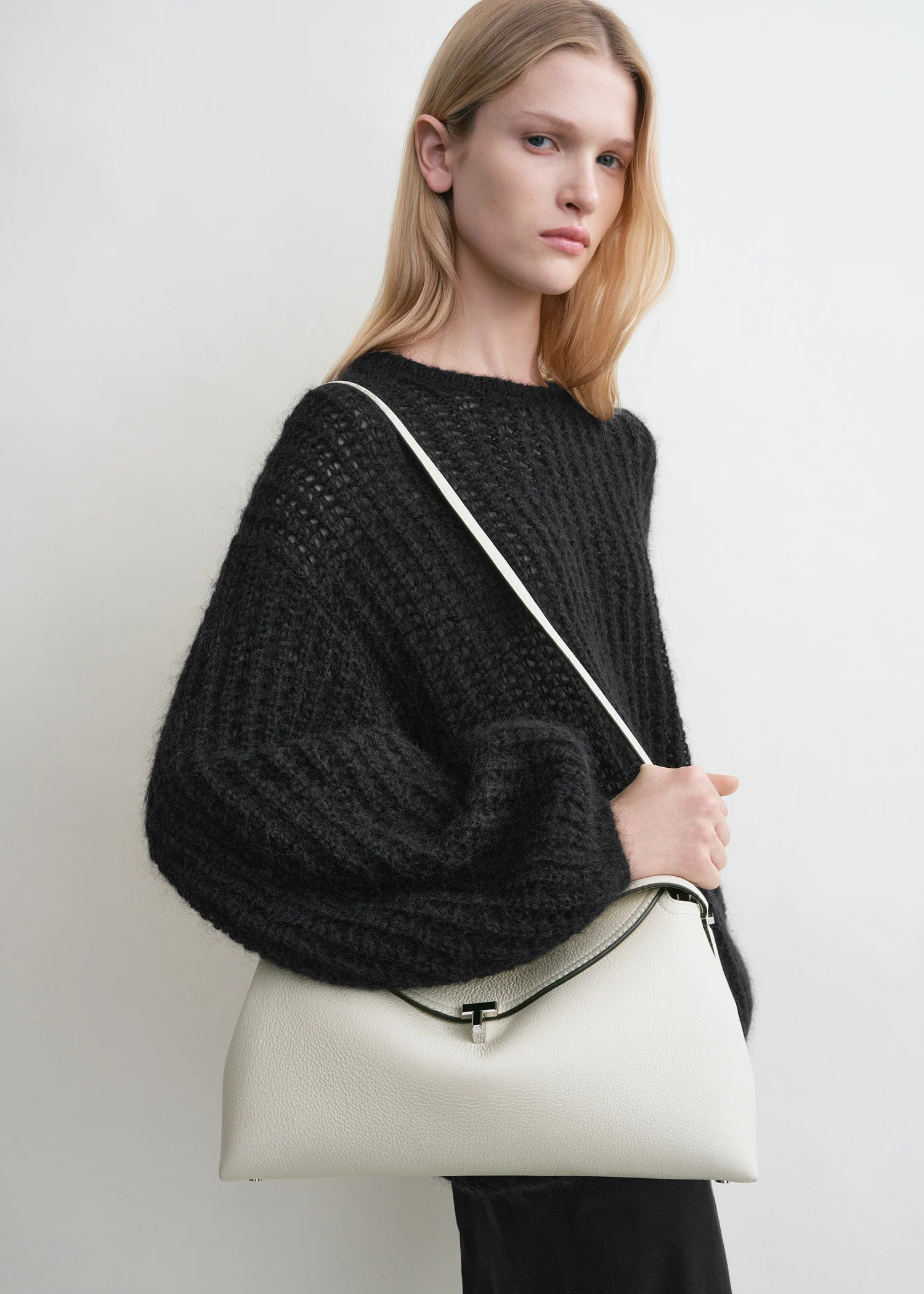 Everyday TOTEME bag sculpted with a curved topline that complements the shape of the hand and arm. It is crafted in Italy from supple yet resilient pebble-grained leather finished with a silver-tone metal T-lock, contrast topstitching and protective feet, then lined in beige microsuede fitted with two leather slip pockets. Carry it from the top handle or from the detachable and adjustable shoulder strap for different styling options.