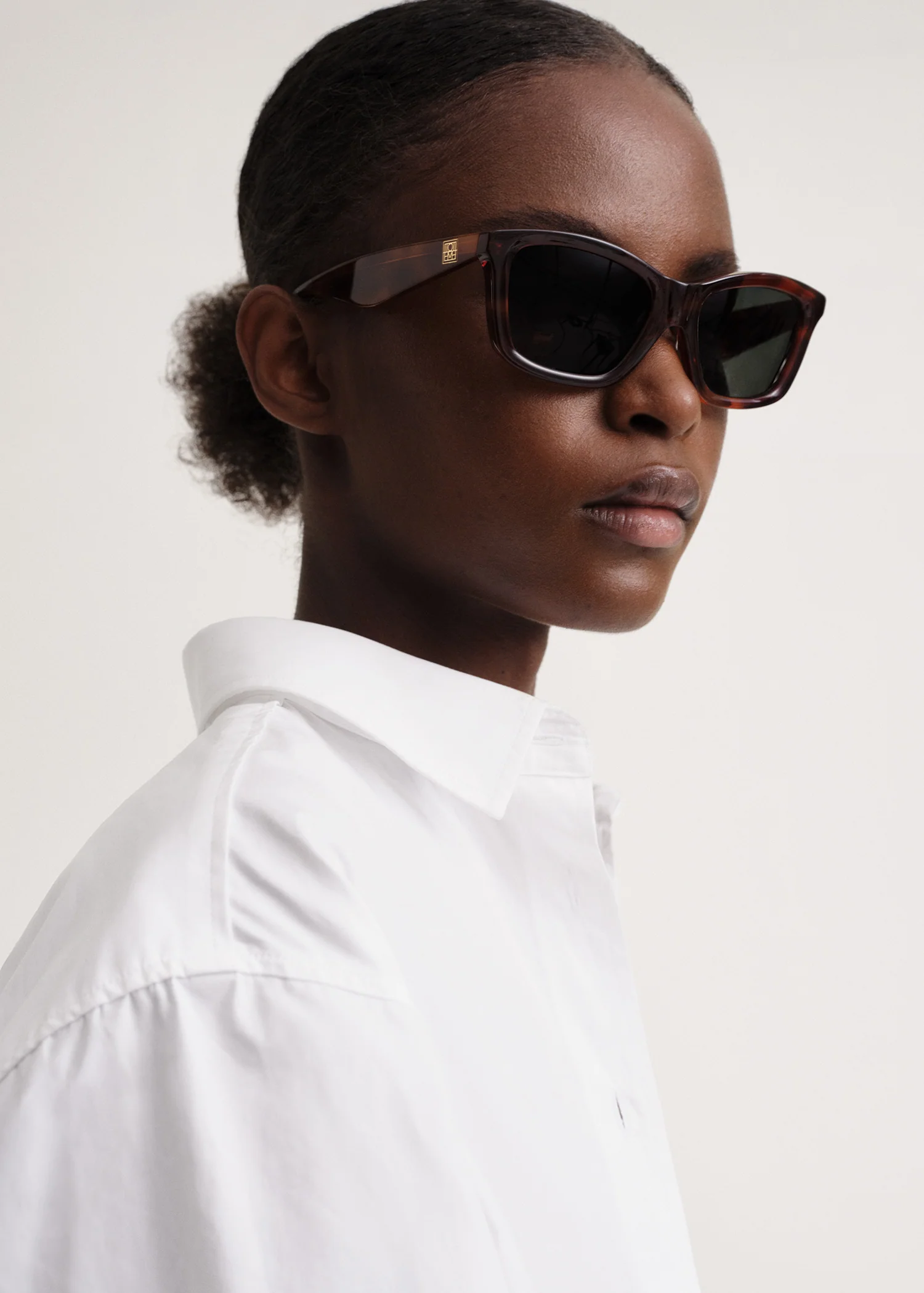 TOTEME sunglasses sculpted to a classic silhouette that blurs the lines between square and cat-eye frames. They're made in Italy from polished acetate with softly rounded edges and strong arms to add definition and are set with UV-protected, green-tinted lenses and a gold-tone monogram plaque. Wear them with anything from swimwear to tailoring.