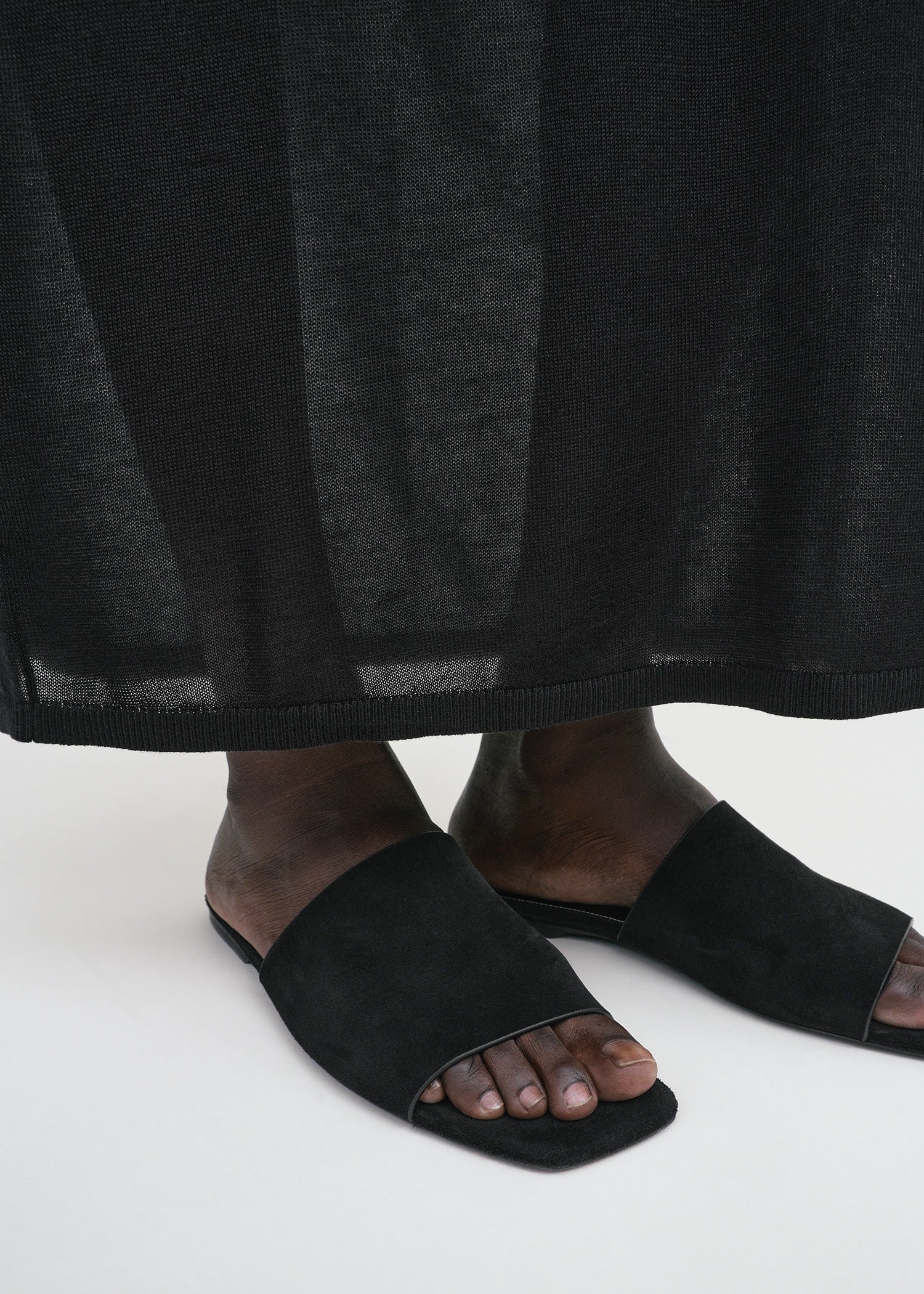 TOTEME slides crafted from soft velour leather with a minimalistic bandeau-style upper. They have a leather insole and sole and are slightly padded at the heel for comfort. Slip them on under dresses and skirts.